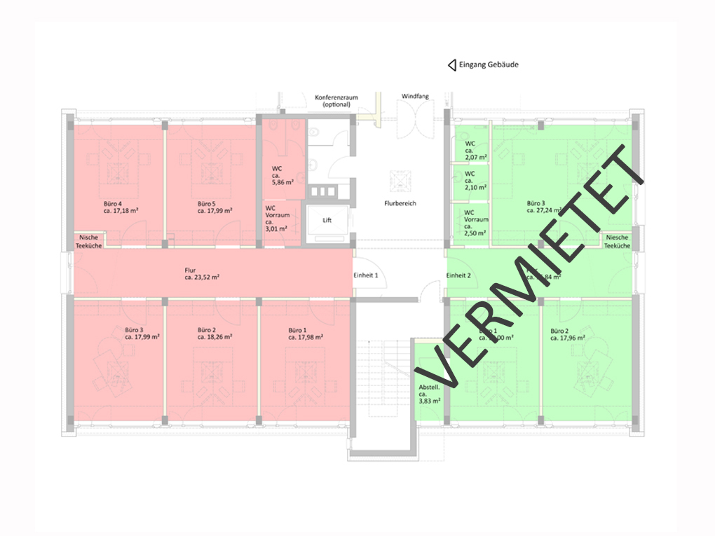 Die ca. 122 m² große und helle Gewerbefläche bietet ideale Voraussetzungen für zeitgemäßes Arbeiten. Die Einheit bietet 5 Büroräume, die jeweils ca. 18 m² groß sind, neue Holz/Alu-Fenster mit 3-fach Verglasung, edlen Vinylboden in Holzoptik, Daikin-Klimageräte mit Heizfunktion, neue Elektroinstallationen, neue Heizkörper, Datenkanäle, Netzwerktechnik und Medienserver. Bereits vor ca. 3 Jahren wurde der Sanitärbereich erneuert, der über zwei WCs verfügt. Beim aktuellen Umbau der Einheit wurde auch im Flurbereich an eine Nische für eine Teeküche gedacht. Außerdem gehört ein eigener Abstellraum im Untergeschoss hinzu, welches bequem vom Foyer über einen Aufzug erreichbar ist. Optional können zwei Kfz-Stellplätze im Hof angemietet werden. Der sich im Erdgeschoss befindende Konferenzraum, der zum Obergeschoss gehört, kann bei Bedarf und nach Absprache gegen eine Aufwands-entschädigung temporär genutzt werden.